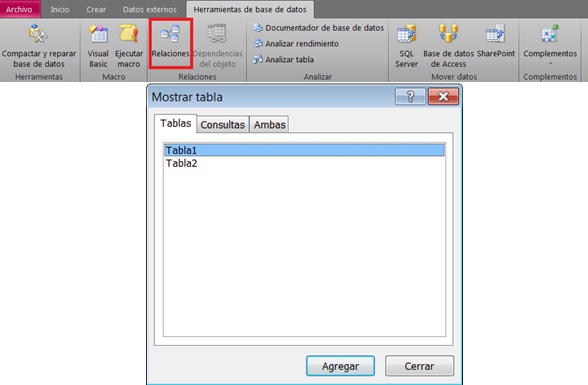 opción “Relaciones” y aparecerá un cuadro con el listado de las tablas que